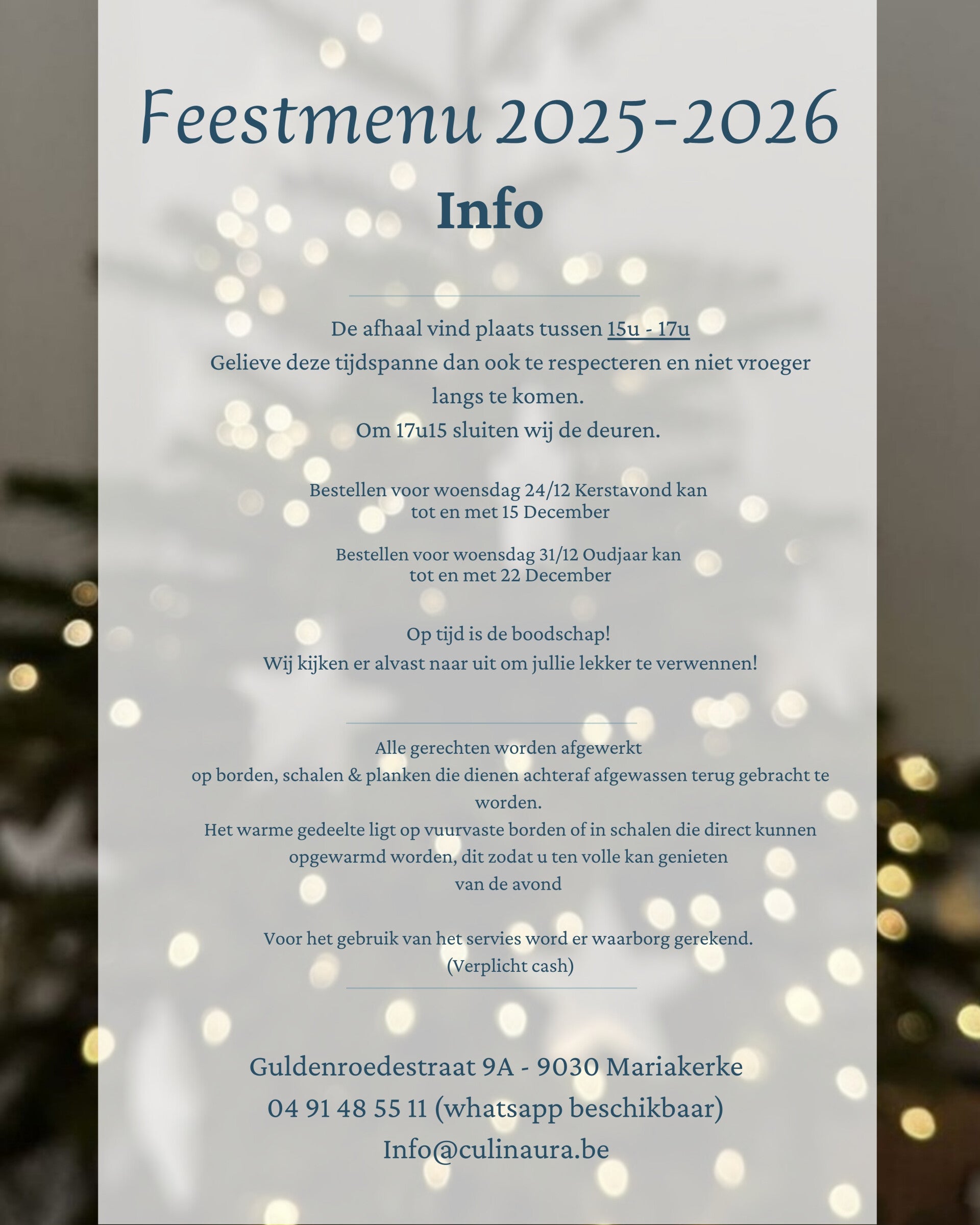 Culi-(n)aura, gelegen in het gezellige Mariakerke (Gent), wordt met passie geleid door de jonge onderneemster Laura. Als echte Gentse met een liefde voor de culinaire kunst, heeft zij in 2021 deze verfijnde zaak opgezet. De naam 'Culinaura' weerspiegelt haar gastronomische persoonlijkheid.