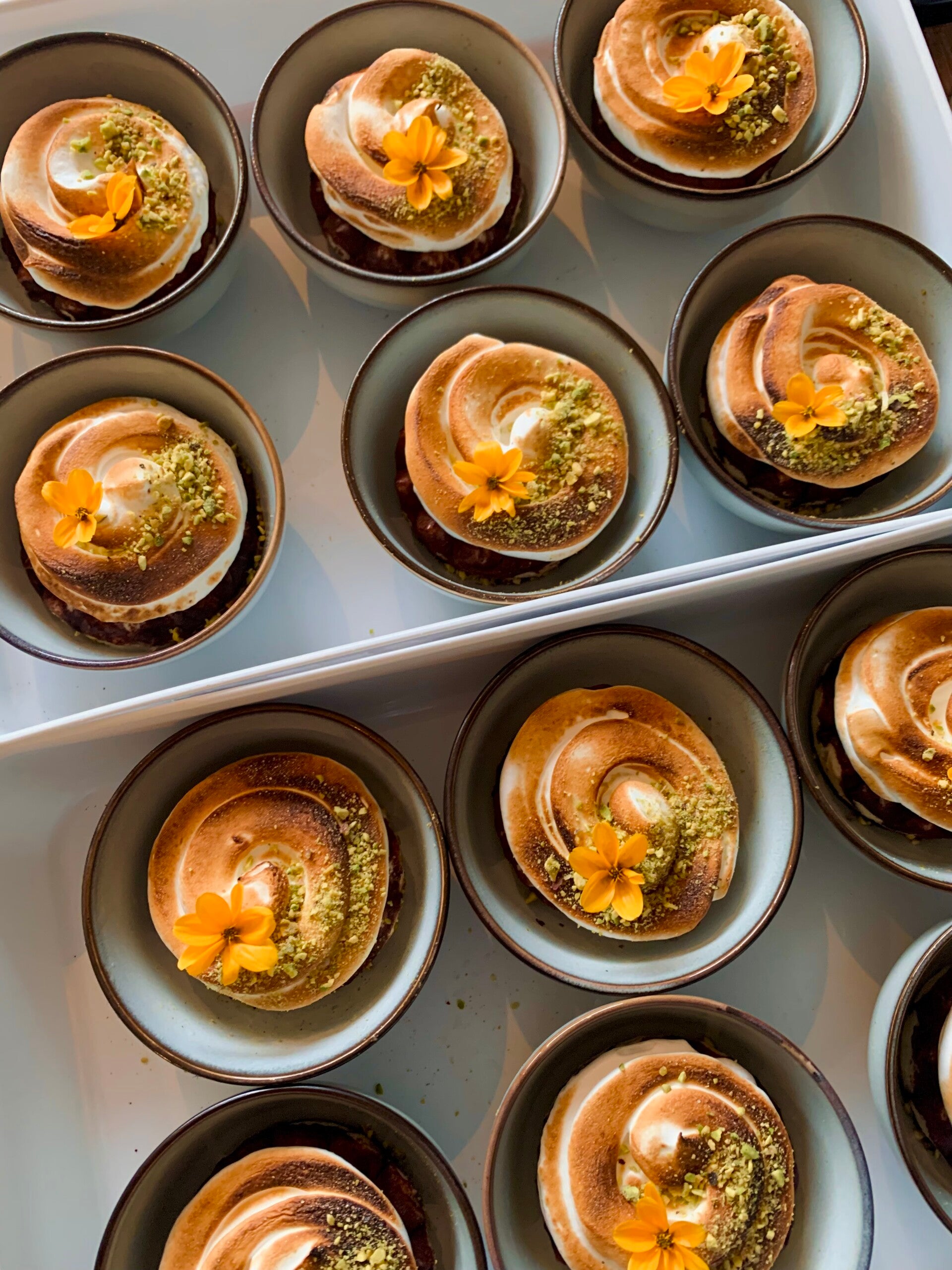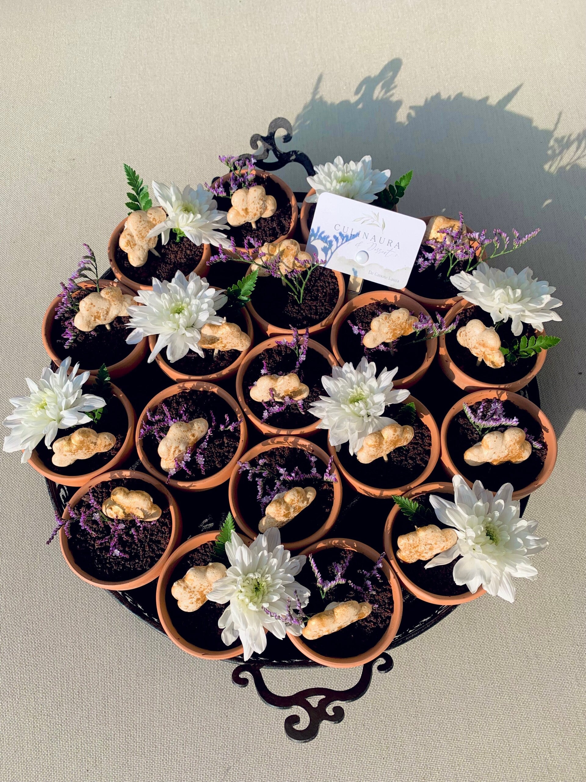 geserveerd op originele manier in stenen bloempotje met crumble van brownie en koekjesdeeg verse bloemen, kruiden en versiering indien gewenst